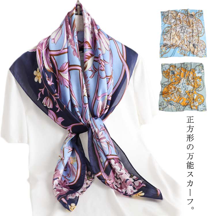 シルクタッチの上品な大判スカーフ、日焼け対策や冷房対策に。デザイン豊富でおしゃれな風呂敷としても、旅行時のコーディネートに活躍。