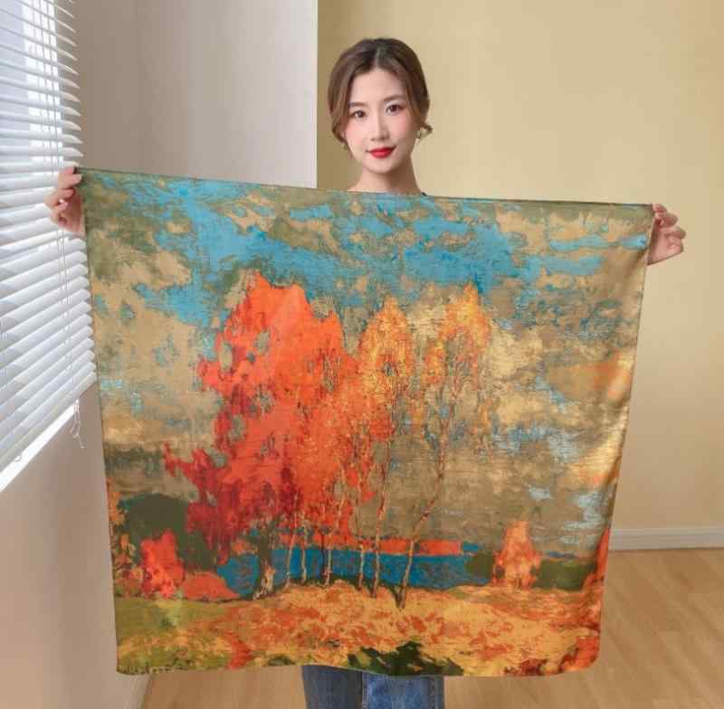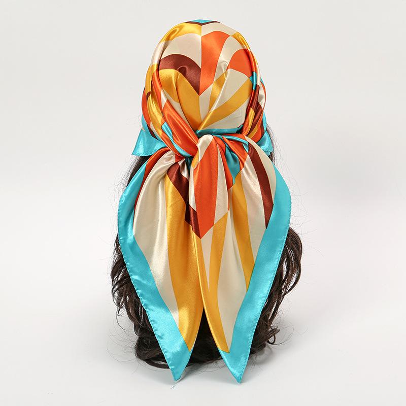 今年もスカーフは大流行!光沢があり、やや固め90cm角シルク調スカーフお勧め。