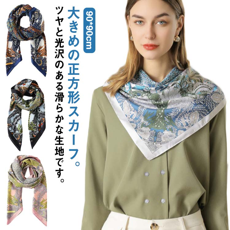 シルクタッチの上品な大判スカーフ、日焼け対策や冷房対策に。デザイン豊富でおしゃれな風呂敷としても、旅行時のコーディネートに活躍。