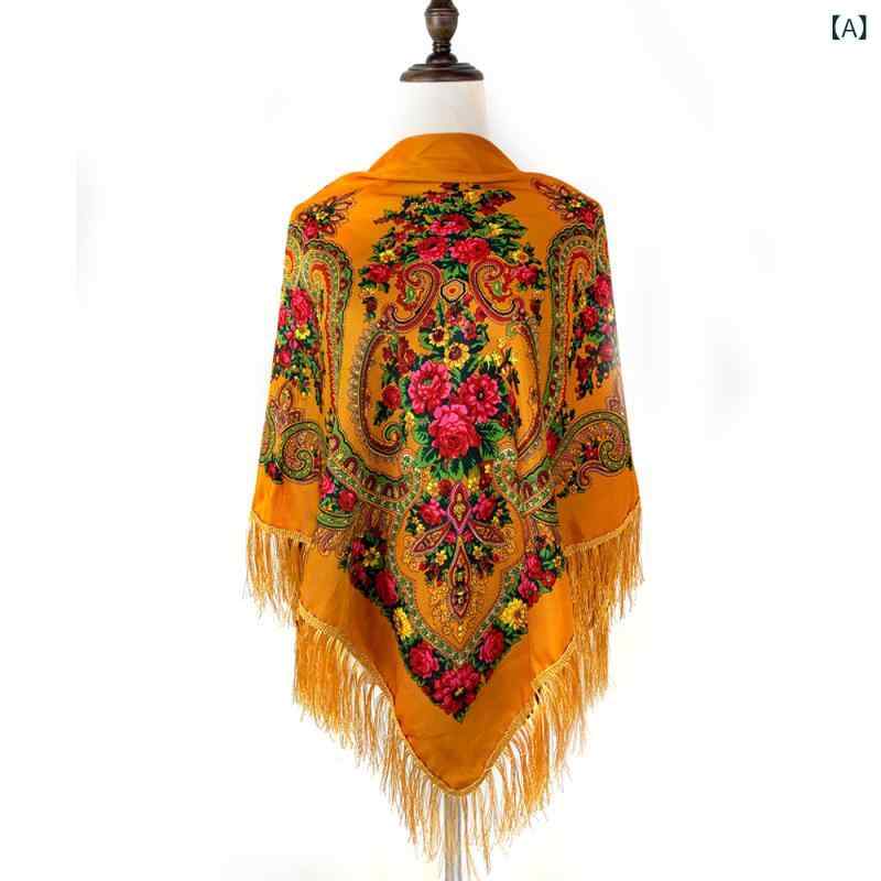 ショール レディース レトロ ロシア風 花柄プリント 民族調 大判 正方形 フリンジ ストール マフ・・・