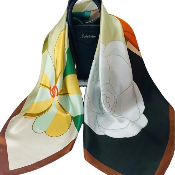 シルクタッチの上品な大判スカーフ、日焼け対策や冷房対策に。デザイン豊富でおしゃれな風呂敷としても、旅行時のコーディネートに活躍。