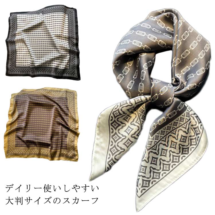 シルクタッチの上品な大判スカーフ、日焼け対策や冷房対策に。デザイン豊富でおしゃれな風呂敷としても、旅行時のコーディネートに活躍。
