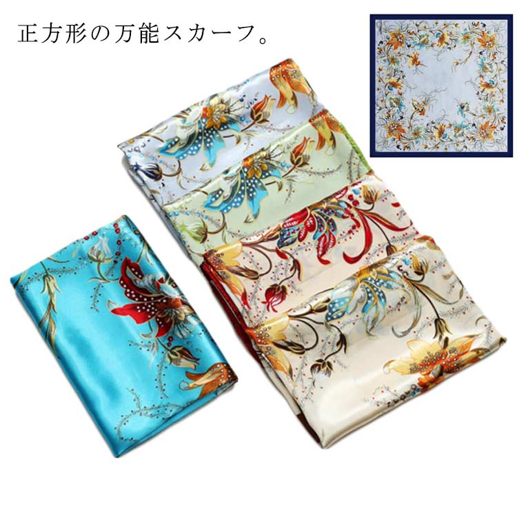 シルク調 スカーフ 正方形 花柄 総柄 ヘアクセサリー 90cm レディース ストール 柄 レトロ ・・・
