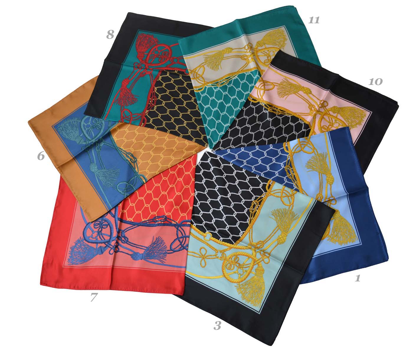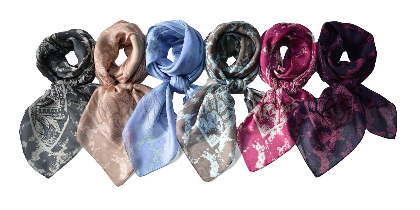 シルク100%証明書取得済。極上の天然素材、シルク100%のスカーフ。日焼けや冷房から華やかに守り、バッグや髪にエレガントなアクセント。