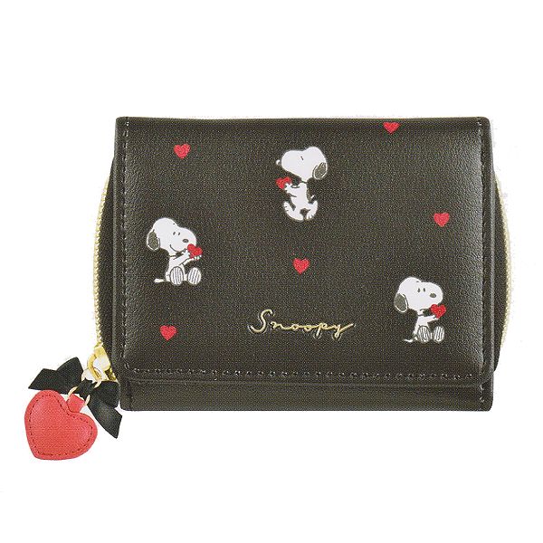 75145 ラッピング袋無料 人気キャラクタースヌーピーの三つ折り財布 ハートとスヌーピーのデザインがとってもかわいい サテンリボン&ハートのチャームもポイント ブラック ネイビー