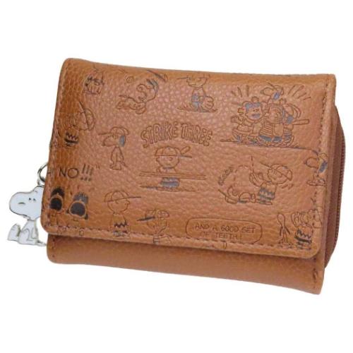 スヌーピー SNOOPY 三つ折り財布ベージュ 茶 プレート ピーナッツ ウッドストック すぬーぴー サイフ 財布 さいふ ウォレット 折りたたみ