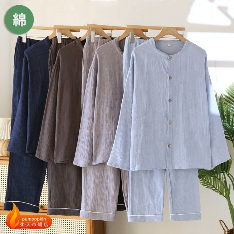 薄手男性パジャマ快適なダブルガーゼパジャマゆったり長袖クレープパジャマメンズ春夏秋綿ルームウェア無地・・・