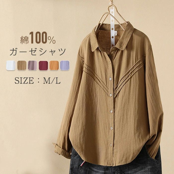 コットンガーゼ生地が柔らかで軽快な着心地!\nガーゼシャツ シャツブラウス 綿100% レディース ガーゼ シャツ 春 秋 冬 無地 長袖 トップス 体型カバー