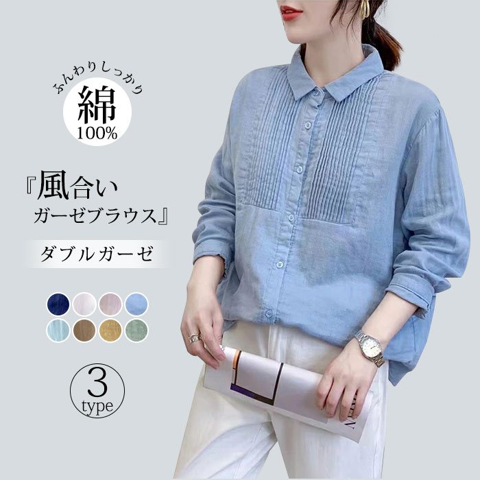 毎年人気のダブルガーゼの春色シャツブラウス。レギュラーとロングの2サイズ。柔らかくしっかりした生地でシワが気になりにくいので持ち運びにも便利。前を開けて羽織にも◎
