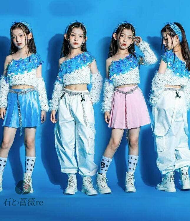 子供ヒップホップダンス衣装 スパンコールtシャツ キラキラ女の子ジャッズダンスHIPHOP プリーツ・・・