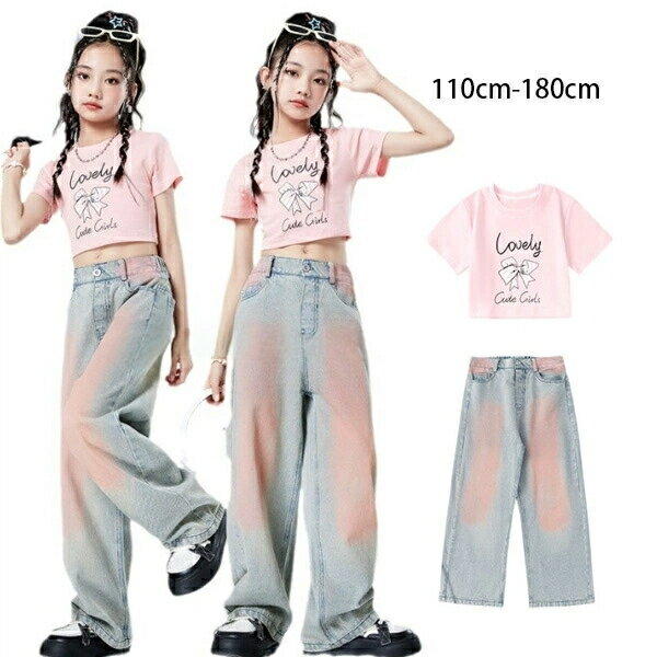 女の子 ダンス衣装 JAZZ セットアップ キッズ hiphop K-pop 舞台 団体服 演出服 女の子 半袖 へそ出し Tシャツ デニムパンツ ストリートダンス ドラムショー 公演服 チアガール 練習着