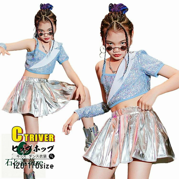 k-pop 衣装 キラキラ キッズダンス衣装 シルバー セットアップ ヒップホップ へそ出し トップ・・・