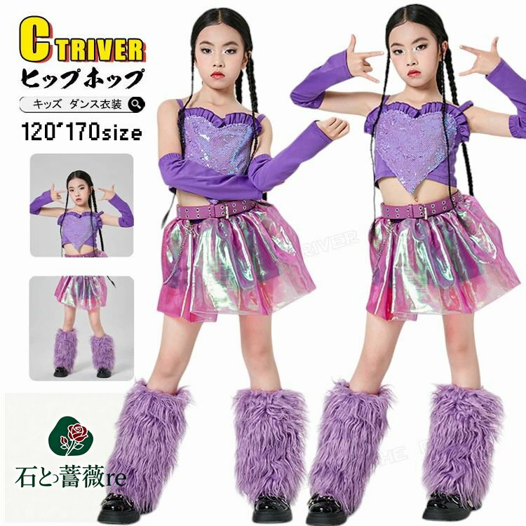 紫 k-pop 衣装 キッズダンス衣装 セットアップ スパンコール チアダンス 衣装 ハート タンク・・・