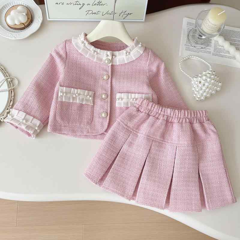 セットアップ 女の子 キッズ 春秋 韓国風 ツイード風 カーディガン 長袖 無地 スカート コットン・・・