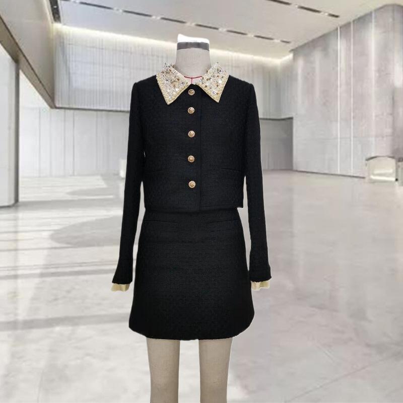 ツイード調 リボン長袖ジャケット プリーツミニスカート セットアップ 黒 30代 40代 50代 おしゃれ レディース 韓国 ファッション