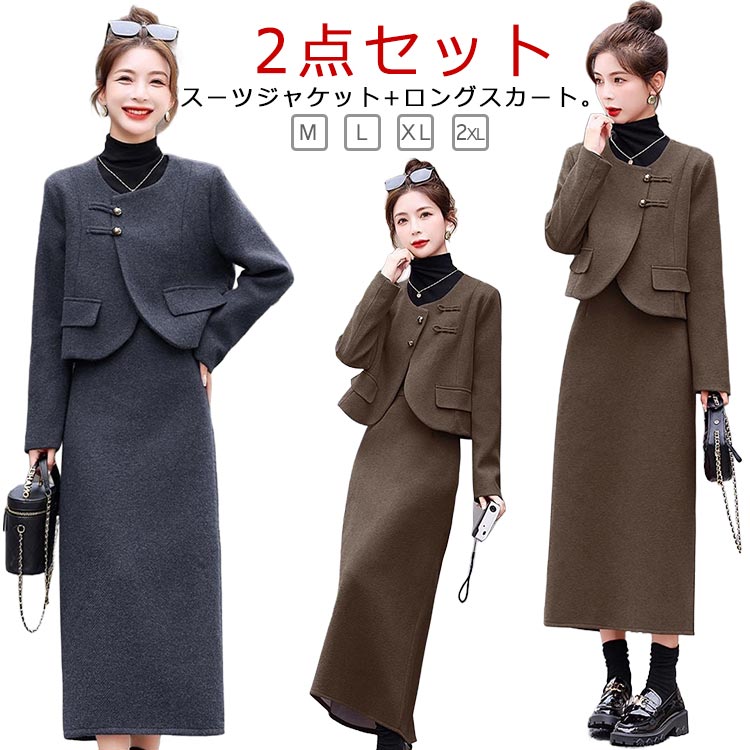 スーツ レディース セットアップ スーツジャケット ロングスカート 2点セット 厚手 裏起毛 ツイー・・・