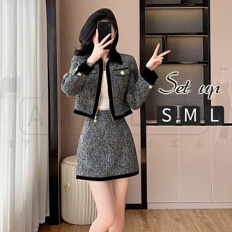 レディース セットアップ ツーピース 韓国ファッション ツイード ショートジャケット 長袖 ミディ丈・・・