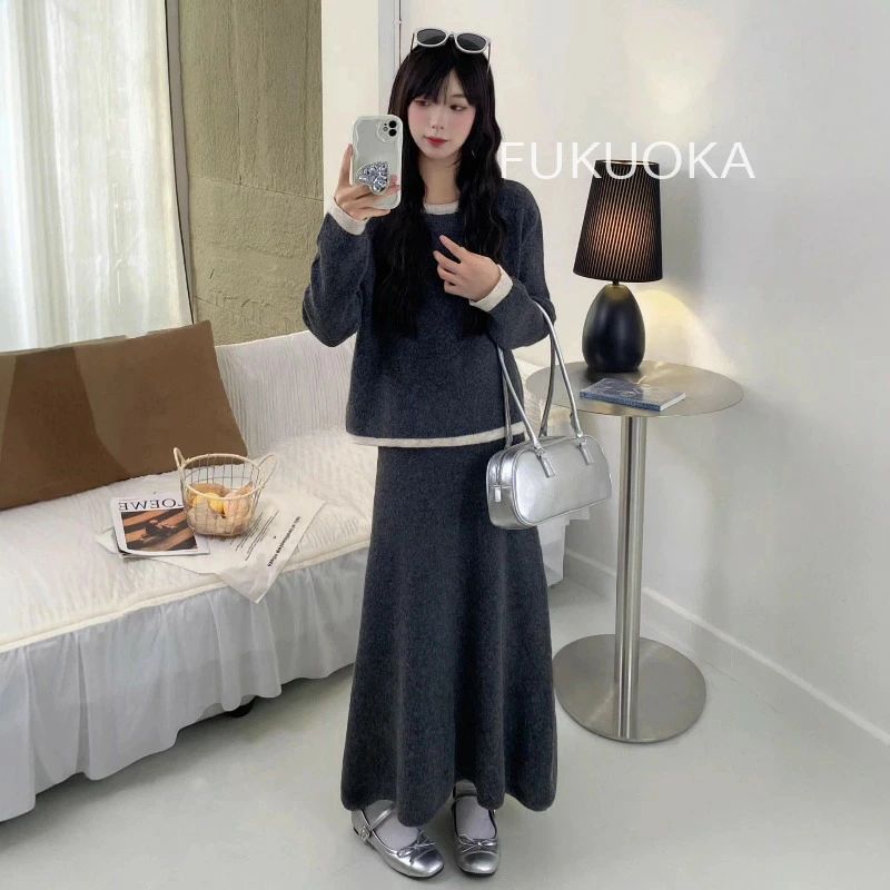 【2025秋冬新作】韓国風ツイード調ニットセットアップ|小香風×配色レース|気質アップの2点セット上・・・