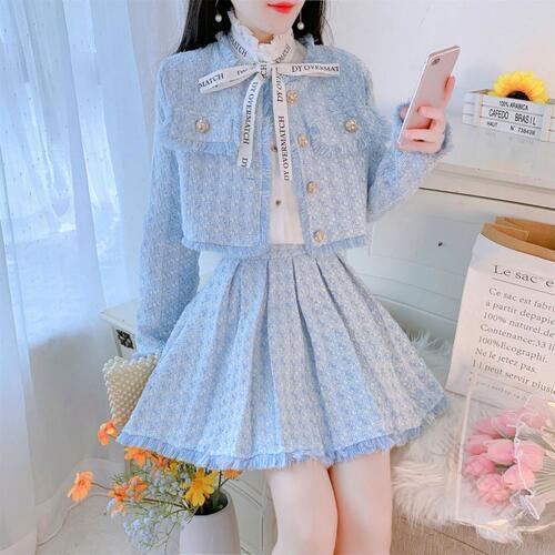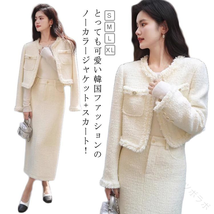 ツイードセットアップ 韓国 レディース ツイードジャケット ツイードスカート ショート丈ジャケットとロングスカートの可愛い韓国ツイードツーピース