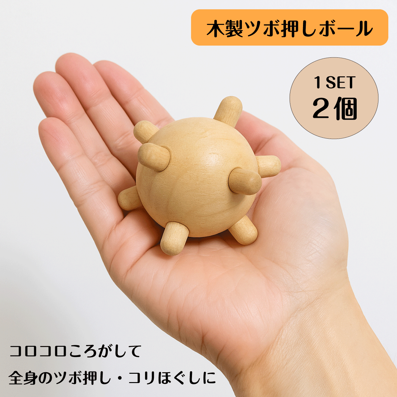 マッサージ・リハビリに使える木製ツボ押しボールです。ボールを手のひらでコロコロと転がすだけでツボを心地よく刺激することができます。リラックスタイムやちょっとした気分転換にも!