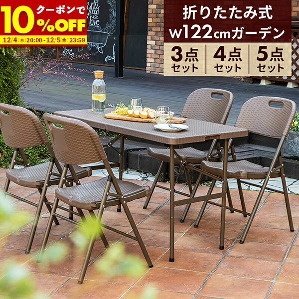 折りたたみ ガーデンテーブル 幅122cm 3点 4点 5点 セット ベンチ ブラウン おしゃれ ラタン調 バルコニー 屋外 アウトドア 庭 テーブルセット ベランダ テラス 折り畳み コンパクト