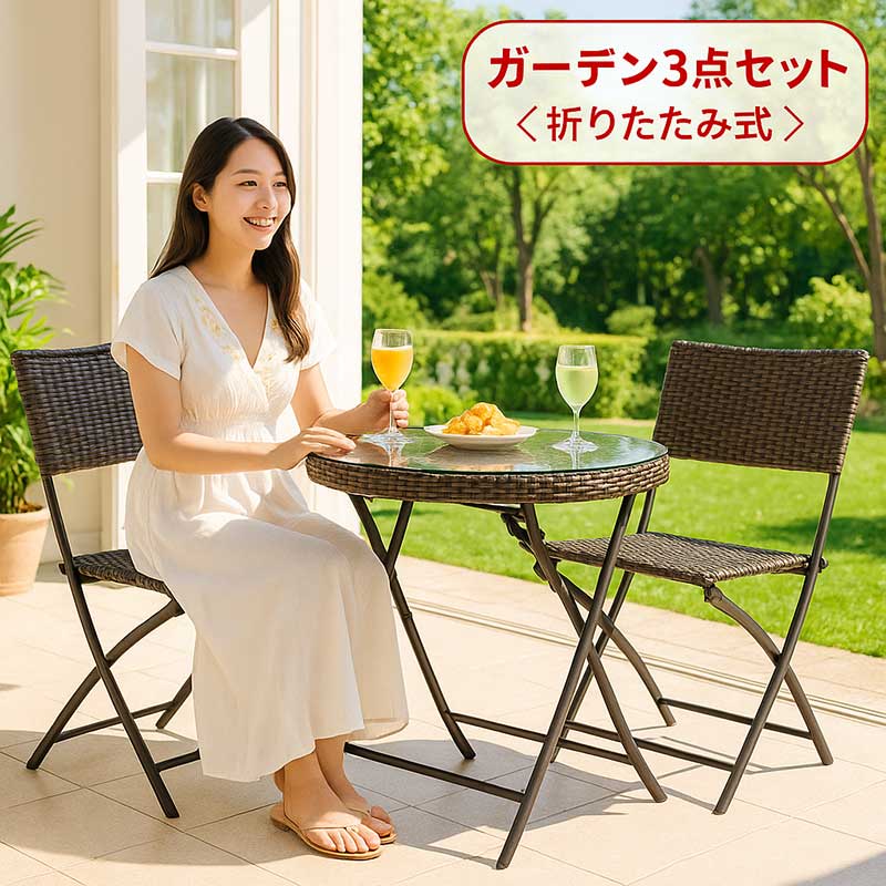 ガーデンテーブルセット 折り畳み 雨ざらし ラタン調 丸 円形 軽い 軽量 ガーデンテーブル3点セッ・・・