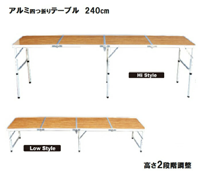 アウトドア 折りたたみ テーブル ロング 240cm×60cm 軽量! アルミ 4つ折り 高さ 2段・・・ 持ち運びも組み立ても簡単!! ハイスタイル ロースタイル 2WAY仕様 マルシェ 子供会 バザー お庭でBBQ 横幅240cm 四つ折り 畳める コンパクト 木目調 おしゃれ 5073 円 レビュー46件 平均評価4.54 ショップ名 カー用品のe-フロンティア |