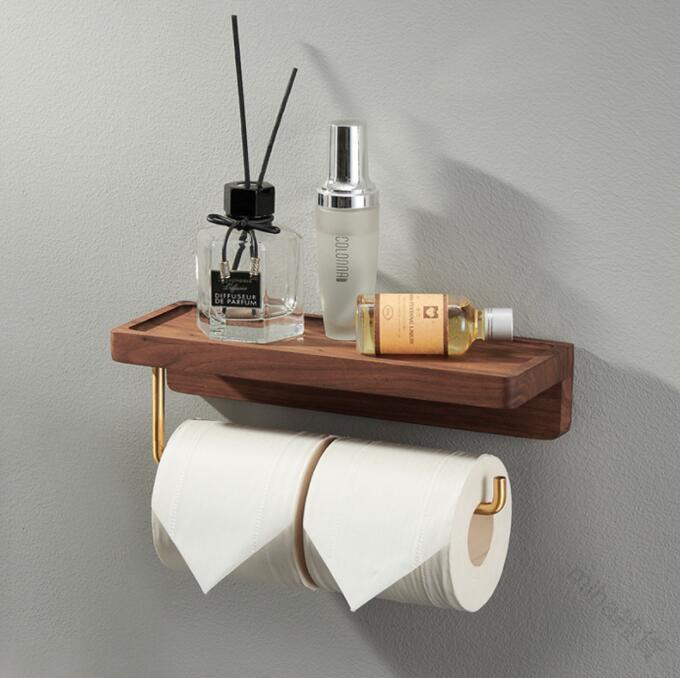 トイレットペーパーホルダー 木製の小物置き 金属製のアーム ゴールドカラー ナチュラル ブラウン・・・