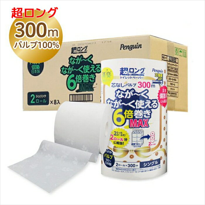 トイレットペーパー 丸富製紙 ペンギン芯なし 6倍長巻き 超ロングMAX300m パルプ シングル ・・・