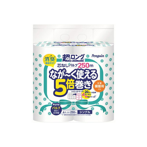 トイレットペーパー シングル 芯なし ペンギン芯なし超ロング(パルプ)250m4Rシングル 2605・・・