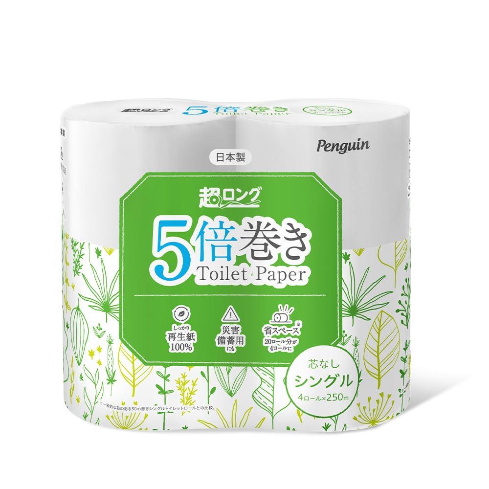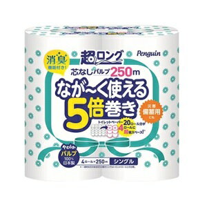 【丸富製紙】 ペンギン 芯なし 超ロングパルプ 5倍巻 シングル 250m×4ロール 【日用品】・・・