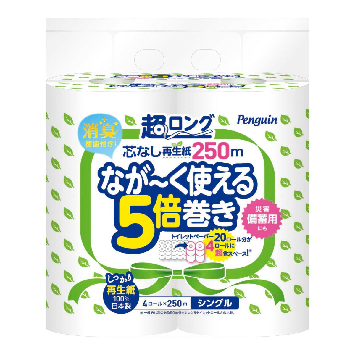 丸富製紙 ペンギン 芯なし 超ロング 再生紙 5倍巻き 4ロール×250M シングル トイレットペー・・・