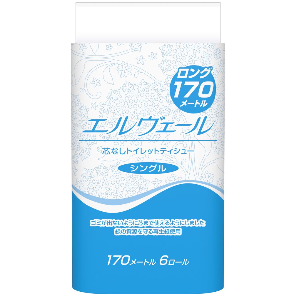 (ケース販売)エルヴェール トイレットティシュー シングル 170m×6ロール 芯なし 8パック ト・・・
