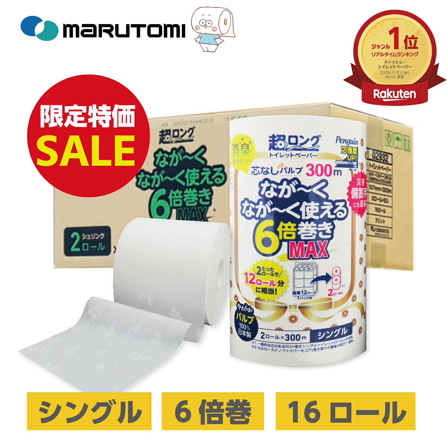 当店人気No.1 長持ち 5倍巻きより長い!6倍巻き※の国内最長級* 300m上質再生紙100% トイレットペーパー 業務用 シングル 芯なし 地域限定 送料無料 メーカー直送 日本製