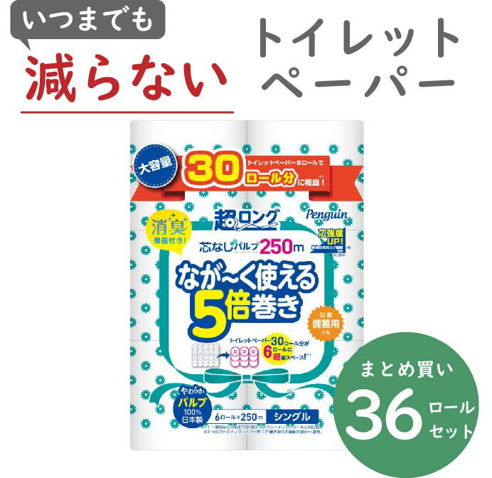 \最安値に挑戦中/ ペンギン 超ロング 5倍巻き 6ロール × 6パック 芯なし シングル 250m・・・