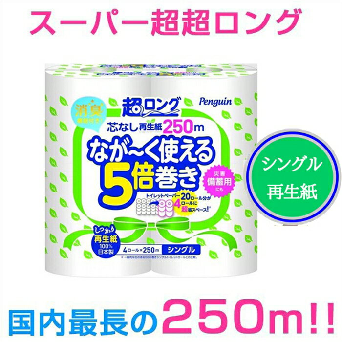丸富製紙 ペンギン 芯なし 超ロング250m 再生紙 トイレットペーパー シングル 4ロールX4パッ・・・