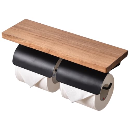 トイレットペーパーホルダー おしゃれ 2連 棚板付き 天然木 木製