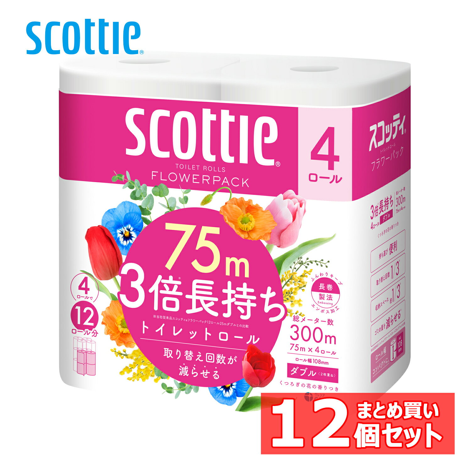 スコッティ フラワーパック 3倍長持ち 75m 4ロール ダブル×12パック トイレットペーパー s・・・