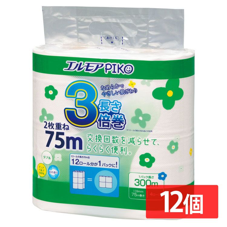 【12個セット】トイレットペーパー 香り付き エルモア ピコ 3倍巻き 4ロール ダブル 75m 1・・・