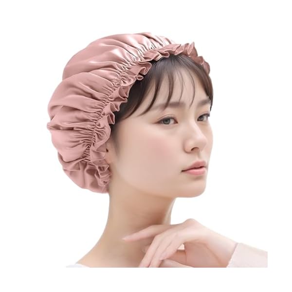 絹100%のなめらかさで枕とのこすれをおさえやすい就寝用キャップ。ロングヘア対応のゆったり形状、頭囲60cmまでのレディース向けピンク。艶髪ケアと乾燥対策に