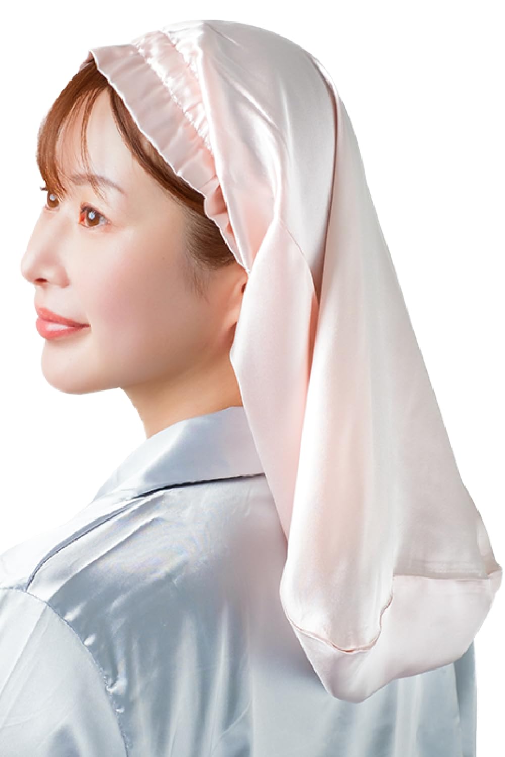 シルクのナイトキャップで髪を包み込んで優しく守る。睡眠中の髪の乱れ、摩擦、乾燥対策に。