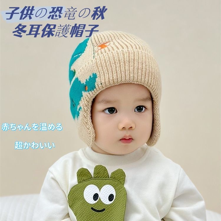 美品登場☆ ニット帽 1~3歳の赤ちゃんキッズ ベビー 帽子 子供用小さな恐竜 帽子 耳あて 防寒帽・・・