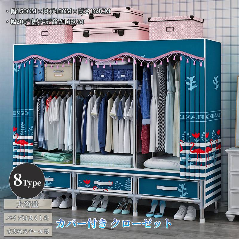 カバー付きハンガーラック 棚付き スチールラック 丈夫 ワードローブ クローゼット 幅150