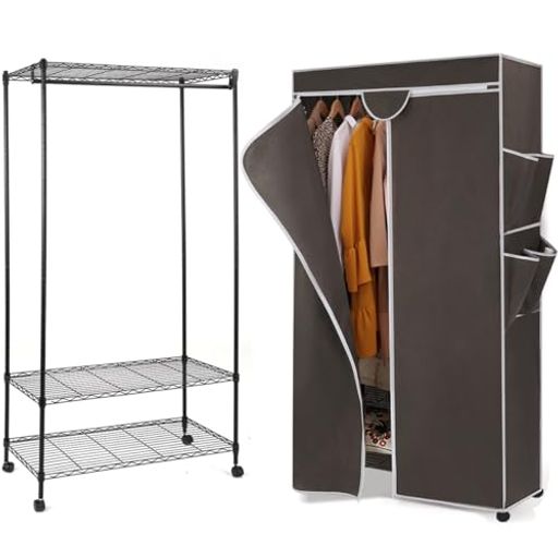 Huaniunワードローブカバー付きハンガーラック頑丈ワードローブ大容量洋服ラック棚付き洋服掛けスチ・・・