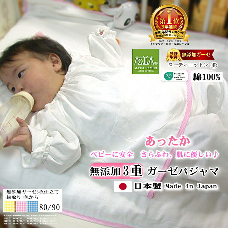 楽天1位★松並木 無添加 ガーゼ 3重 あったか パジャマ 80 90 ベビー キッズ 長袖 縁/3・・・