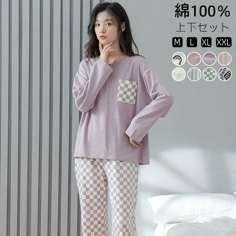 ルームウェア レディース 綿100% コットン 秋 春 長袖 パジャマ かわいい 上下セット ワイド・・・