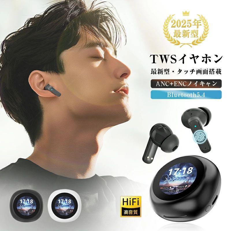 2025最新 完全ワイヤレスイヤホン Bluetooth5.4 タッチディスプレイ付き 1.28インチ カナル型 TWS 片耳/両耳 ENC ノイズリダクション ANC ノイズキャンセリング