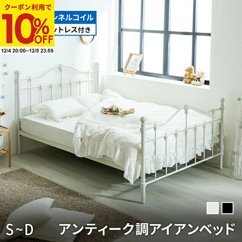 送料無料 クラシックアイアンベッド マットレス付き シングル セミダブル ダブル ベッド下 アンティークベッド ベッドフレーム ヴィンテージ 木製ベッド 高密度 ポケットコイルマットレス