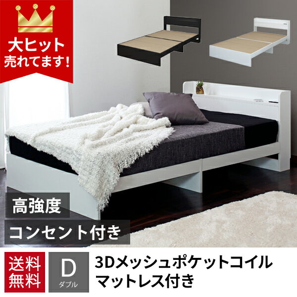 【割引クーポン】ベッド ダブル マットレス付き コンセント付き ダブルベッド マットレス付き 棚 床・・・