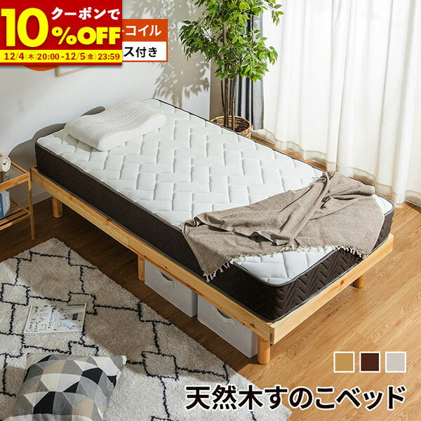 すのこベッド シングル セミダブル ダブル マットレス付き マット付 ポケットコイルマットレスセット 3段階高さ調節 頑丈 パイン材 天然木フレーム ナチュラル ウォルナット ホワイト